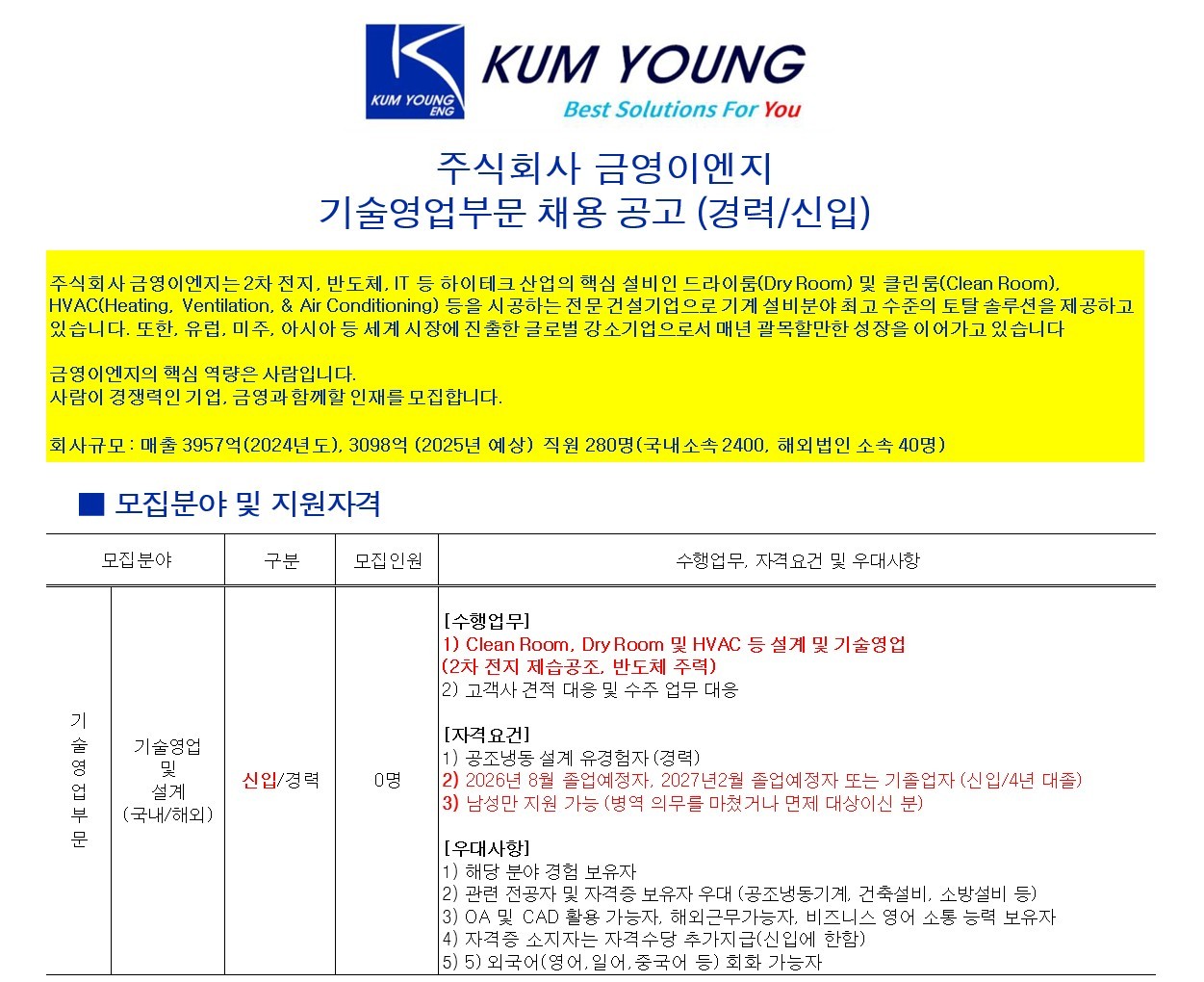 [2026 상반기 금영이엔지 채용공고 안내] *성별 : 남학생 *기졸업자 및, 2026년8월/ 2027년2월 졸업예정자 *학과사무실로 서류 제출 *일자 : 3월 13일 (금)오후 4시까지 (졸업예정자인 경우는 이제헌교수님과 상담 후 지원서 제출)